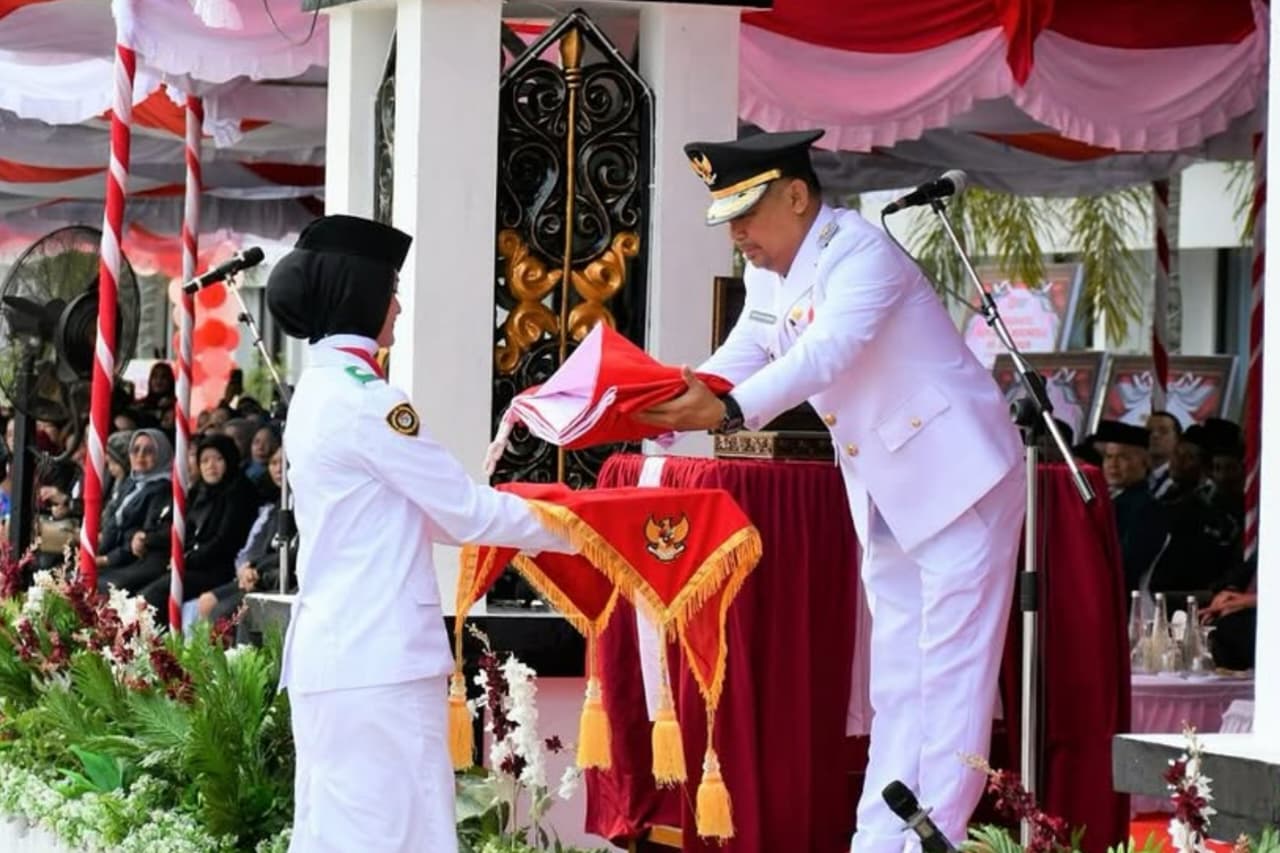 Usai sambutan, upacara dilanjutkan dengan pengibaran bendera Merah Putih oleh Pasukan Pengibar Bendera Pusaka (Paskibraka) Barsel 2025.