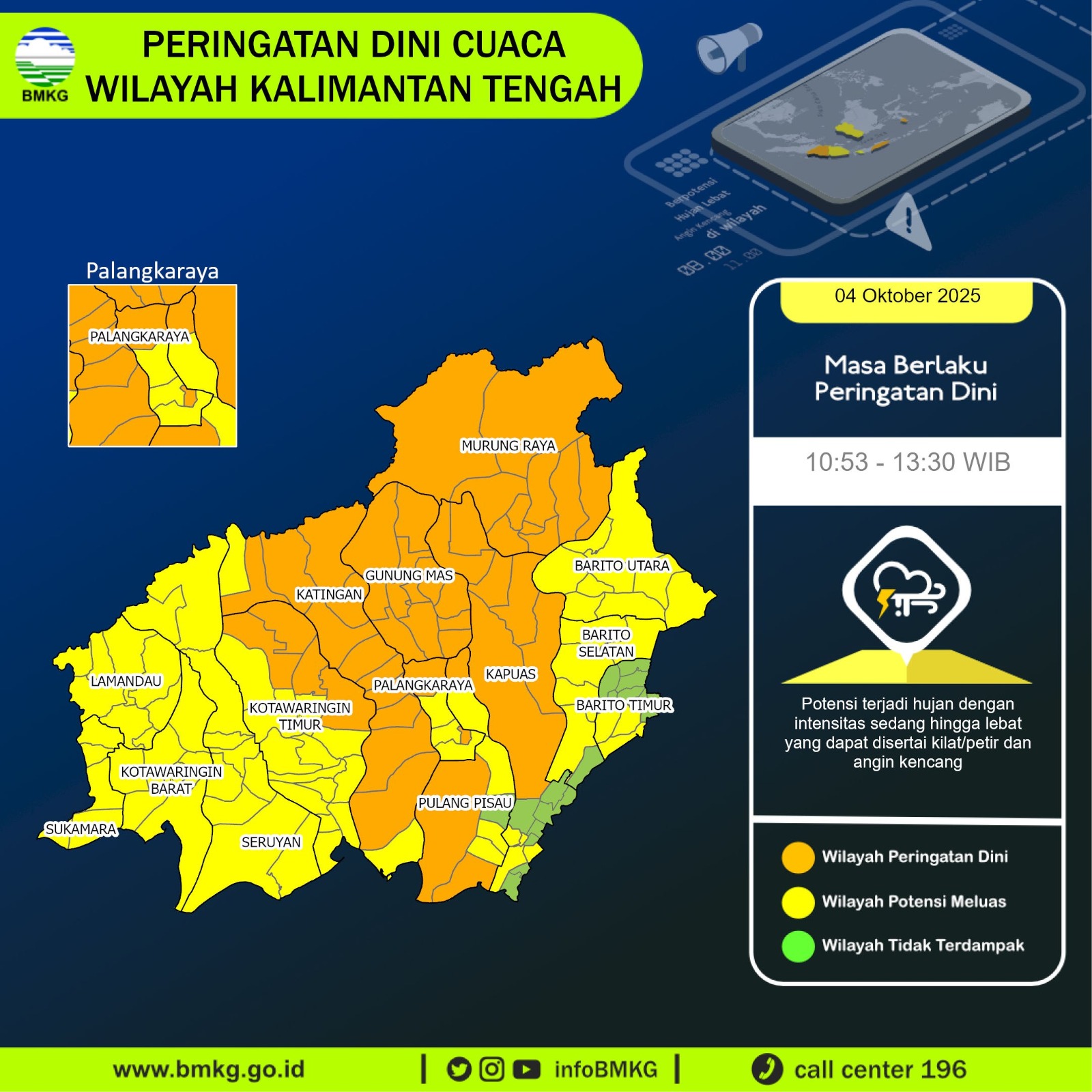 “Kondisi cuaca tersebut diperkirakan terjadi mulai sekitar pukul 10.53 WIB di beberapa kecamatan di Kabupaten Kotawaringin Timur, Kabupaten Kapuas, Kabupaten Katingan, Kabupaten Gunung Mas, Kabupaten Pulang Pisau, Kabupaten Murung Raya, serta Kota Palangka Raya dan wilayah sekitarnya,”ucapnya.
