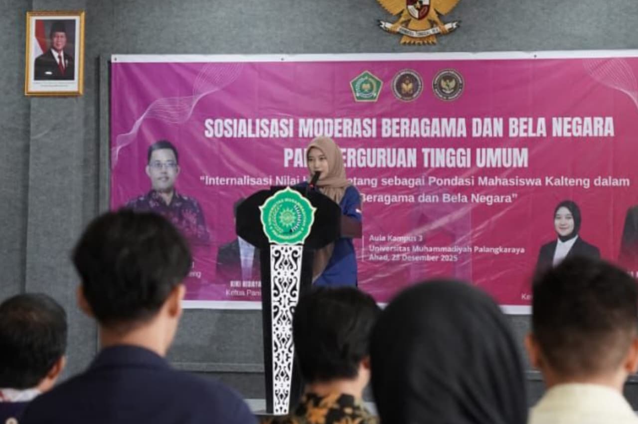 Pengurus Wilayah Pergerakan Mahasiswa Moderasi Beragama dan Bela Negara Kalimantan Tengah (PMMBN Kalteng) menggelar sosialisasi Moderasi Beragama dan Bela Negara bagi mahasiswa perguruan tinggi se-Kota Palangka Raya. Kegiatan berlangsung di Aula Kampus 3 Universitas Muhammadiyah Palangka Raya (UMPR), Jalan Soekarno, Minggu (28/12/2025), sebagai upaya memperkuat semangat kebangsaan, toleransi, serta nilai kearifan lokal Huma Betang di kalangan generasi muda.