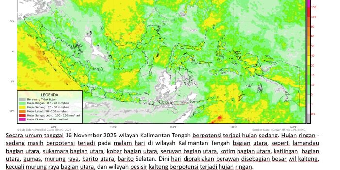 BMKG Keluarkan Peringatan Dini Cuaca di Kalteng, Waspadai Hujan Lebat 17–19 Desember